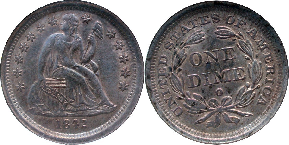 Choice $1250 New December 17! Rose-Blue Toning, Fully Struck, Challenging in AU Grades, Choice Surfaces, New Jersey Collection. 1842 New Orleans dime are well known for being poorly struck due to workmanship or lapped dies. The early New Orleans mint years saw aggressive die maintenance on the smaller demonization dies. Just arrived from the New Jersey Collection is a choice original 1842-O F dime with naturally toned surfaces with are also essentially unabraded. This deep South survivor has been well preserved. F-101, from the die pairing is most noted for full strikes from unpolished dies. This piece would be a CAC candidate if the grading was a bit more conservative, otherwise a fine representative for the date. Housed in NGC Gen 7 (1997-2000) holder.