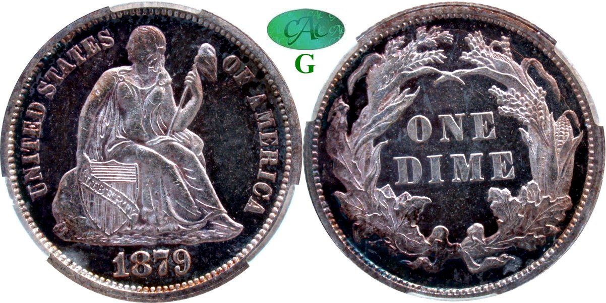 Choice $685 Choice Original, Watery Proof Fields, Light Gun Metal Gray Patina, Fully Struck, Accurately Graded, Gerry Fortin Reference Collection. An absolutely original 1887 proof dime with watery mirrored fields. As in the case with most proof Seated dime, bright light viewing is required to release the natural coloring and reflective mirrors. In the case of this 1887 specimen, a light source exposes subtle sky blue and light gold on the obverse. These same colors are more pronounced on the reverse and quite attractive. A 10x loupe inspection revealed several die polish lines on the reverse that should not be mistaken for hairlines. Accurately graded and off the market for several decades. Freshly graded and housed in 2015 style PCGS holder. From the Gerry Fortin Liberty Seated Dime Reference Collection.