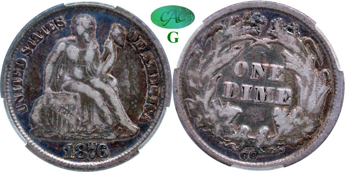 Cleaned $495 New October 28! Very Rare F-112 Rotated Reverse, Rose-Gray Patina, Old Cleaning, Cleveland Collection. . Consignor Price Reduction. An important opportunity to acquire a higher circulated grade 1876-CC F-112 example, an R7 variety in VF or better. The F-112 die variety results when the F-106 reverse, previously paired with double die obverse, is subsequently paired with a fresh obverse die. That die pairing was brief and resulted in varying degrees of reverse rotation on the few survivors seen. A handful of F-112 examples have been located after years of searching by Liberty Seated dime die variety specialists. This example is a duplicate from the Cleveland Collection after purchasing the 1876-CC F-112 plate coin at The Definitive Resource for Liberty Seated Dime Variety Collectors ($1350). This duplicate grades full EF45 but have been cleaned in the past. Surfaces have retoned a consistent rose-gray. Housed in PCGS Gen 4.6 holder with label reading, PCGS Genuine, Cleaning - EF Details. A great filler example until a strictly original specimen can be located. Good luck with that hunt.