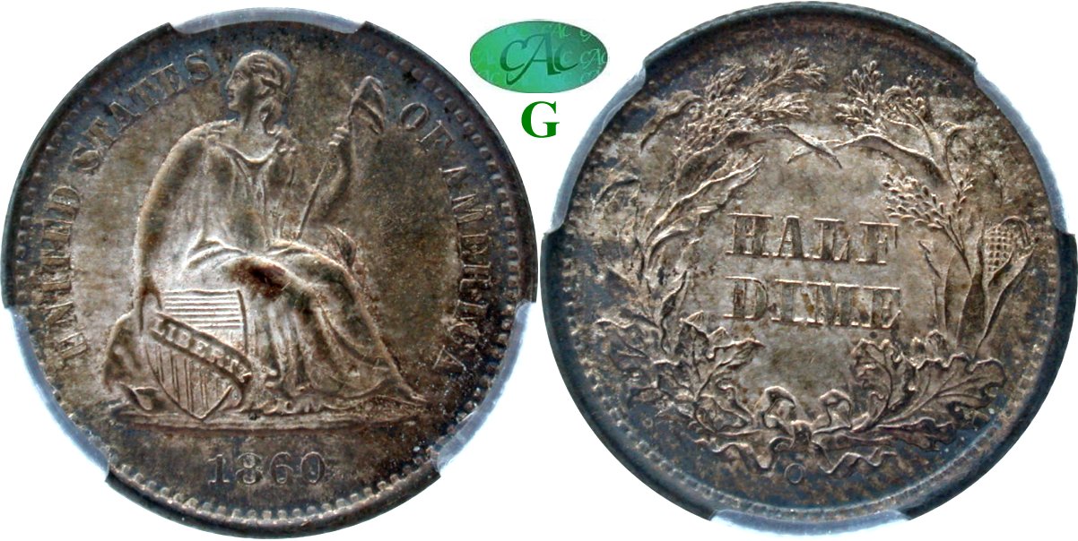 Choice $625 New October 13! Frosted Luster, Complete Strike, Well Preserved, Sheffield Collection. With a smidgen over 1,000,000 struck, the 1860 New Orleans issue falls into the "common" realm though premium Mint State survivors are limited. The Sheffield Collection is releasing a conservatively graded example with frosted luster and a fully detailed strike. Intermixed grays and brown shades are overlaid on a silver background on the obverse while the reverse presents light gold with aquamarine towards the borders. The CACG census tally is seven graded with a price guide value of $625 at grade. The offer price is quite reasonable for a quick sale. Housed in new CACG holder and graded to strict standards employed for CAC stickering approval.