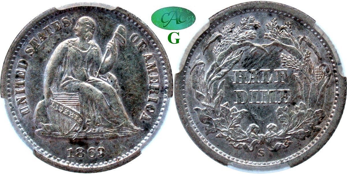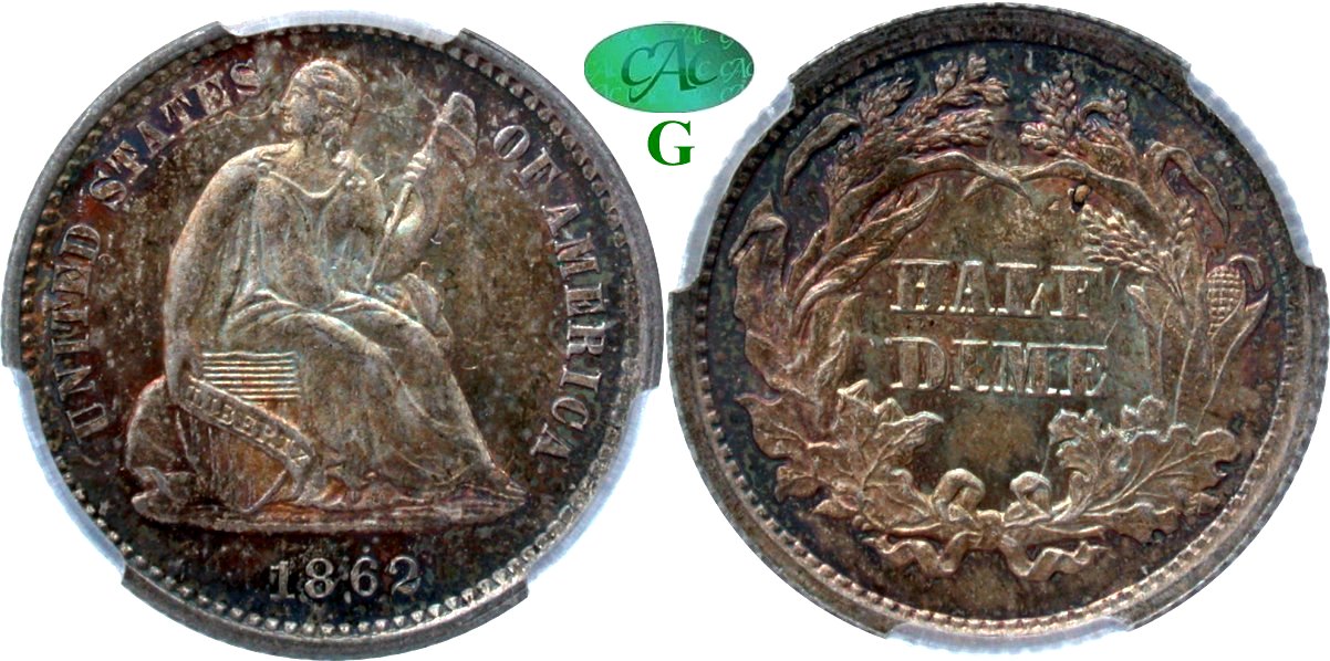 Gem $800 New October 13! Gem Original, Superb Originality, Sheffield Collection. There is no question concerning the strict CACG grading standards when handling an ever increasing amount of Seated material in their holders. This 1862 Philadelphia struck half dime is typical of those standards wuth brilliant frosted luster regardless of the copper-gold skin. An intricately detailed example, from the Sheffield Collection, with heavy die clashing on both sides. Surfaces are complete unabraded and pleasing. A "common date" with the CAC approved census totaling 132 pieces making this offering ideal for type. The CAC price guide estimates fair market value at $775, thus our offer price is quite fair for this premium quality gem. Housed in new CACG holder and graded to strict standards employed for CAC stickering approval.