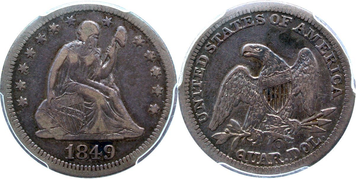 New November 19! Series New Orleans Key Date, Crusty Gray Patina, Choice Original Surfaces, An Old Friend Returns. The mintage for 1849 New Orleans strikes is unrecorded with Briggs estimating a mintage of 16,000 pieces. Few example ever reach the marketplace. However, GFRC customers have been lucky to have access to a steady flow of this date due to collector divestment. This old friend was taken in trade at the Whitman Baltimore show and is an important VF20 duplicate since enter the marketplace in a year's time. Natural surfaces are choice and unabraded. The assigned grade is quite conservative given the elevated obverse scroll and available device details. Uniform gray patina covers both side with some lighter shades on the lower reverse. A strictly original offering that will fill that key date hole in your Liberty Seated quarter collection. Housed in PCGS Gen 5.0 (2015) Dupont hologram holder and ready for immediately placement into another advanced collection.