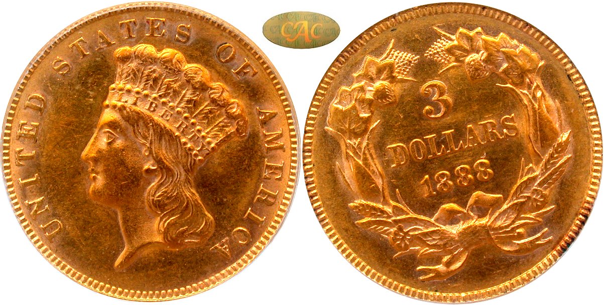 1888 PCGS AU55 Gold CAC OGH - Gem Original - The three-dollar gold piece is an odd-duck in the American series, but there is no denying the appeal of a well-preserved, low-mintage gold coin. Intense, fiery orange-gold shades contrast with the more brilliant rims and protected areas, and the eye appeal is visceral. A few ticks are consistent with the technical grade. CAC has awarded gold stickers to only two 1888 $3s, this piece, and another at the MS62 level. If looking for a single example to illustrate the three-dollar design in a type set, this is the coin. In forming a bid, remember that gold CAC status indicates that CAC considers this example equal to an AU58, CAC-approved piece. Housed in a PCGS Gen 3.1 (1993-1998) old green holder with gold CAC approval. PCGS #2540754.