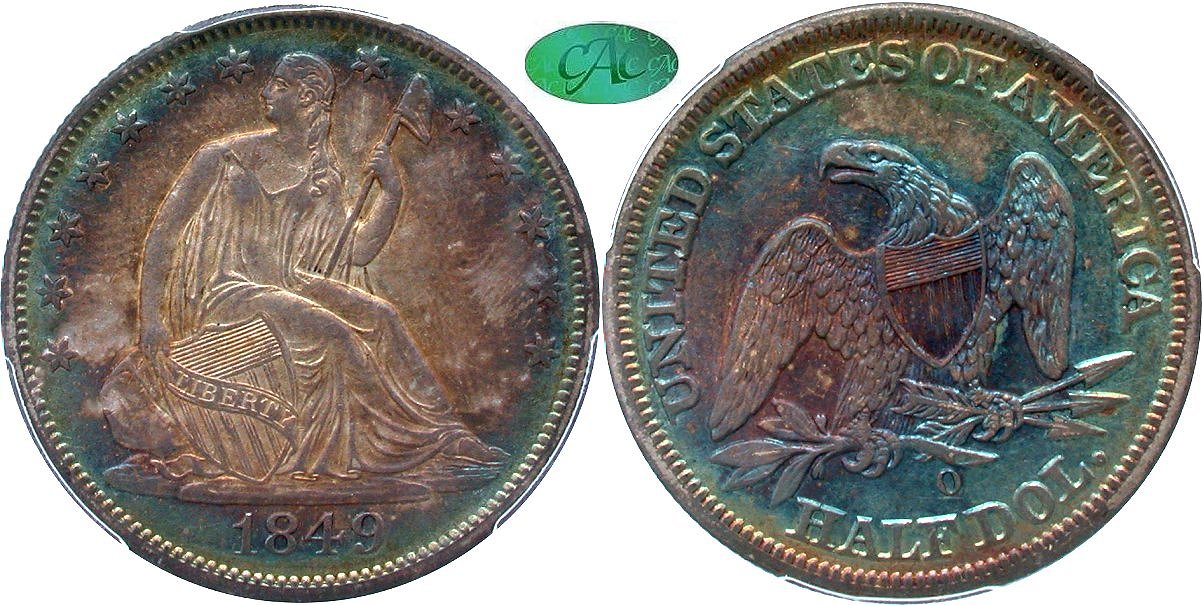 1849-O WB-8 R3 PCGS AU58 CAC - Gem Original - Another wonder coin from the Seal Beach collection, and it's easy to see why the consignor had trouble letting this piece go. The obverse reveals a golden center encircled by sea-green, while a cornucopia of electric blue dominates the reverse. The eye appeal is stunning, and the competition for this piece will be fierce. WB-8 with a die gouge at Liberty's left hand, and a mintmark placed high and to the right, but not touching the stem. The strike is typical, with stars to the right a touch soft. Coin collections are best built not when funds are available, but when coins are available. This is a such a situation, and a coin worth reaching for. Housed in a PCGS Gen 6.0 holder with CAC approval. PCGS #25604078.