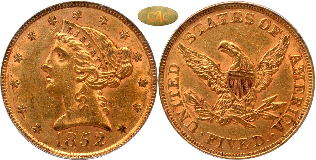 Lot 11 - 1852 PCGS AU50 Gold CAC OGH - United States $5 Gold