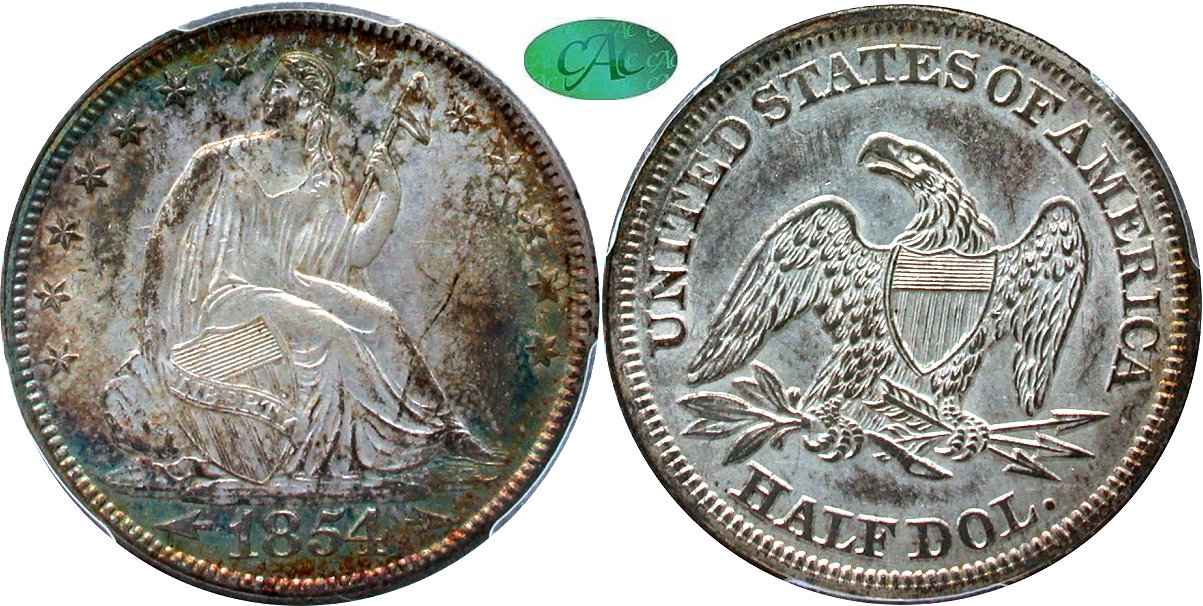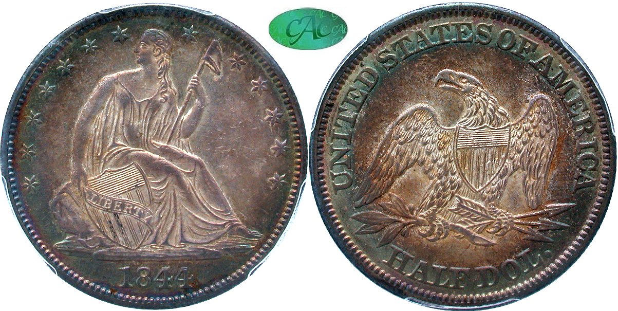 1844 WB-3 R4 PCGS AU58 CAC - Gem Original - This original piece has "the look" - light centers framed by iridescent rims. Central figures are antique silver with gray at the high points, giving way to aqua rings on both sides that are highlighted by occasional plum and rust shades. The eye appeal is compelling, and this coin will attract "strong money." This piece is sharply struck with exceptional detail beneath the reverse shield, the usual problem point for Seated half dollars. A few marks, consistent with the grade, are distributed in the right obverse field. WB-3, with overlapping 8s in the dentils below (1)8(44), and deep clashing in the reverse shield. Housed in a PCGS Gen 6.0 holder with CAC approval. PCGS #34406491