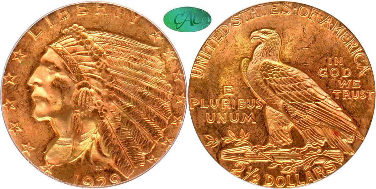 1929 PCGS MS64 CAC OGH - Near-Gem Original - Indian quarter eagles are eminently collectible, and all issues apart from the 1911-D can be acquired at reasonable prices. Pieces graded MS64 represent an ideal collector grade, as values advance rapidly at the MS65 level. CAC-approved MS64s are even better, aesthetically as close as possible to the MS65 grade, but without the hefty price tag. This piece is orange-gold, with a few scattered marks in the right reverse field as normal. The lowest points of the incused central figures, more golden, contrast with orange at the higher points, and the overall appeal is wholesome. Housed in a PCGS Gen 3.1 (1993-1998) old green holder with CAC approval. PCGS #4265388.