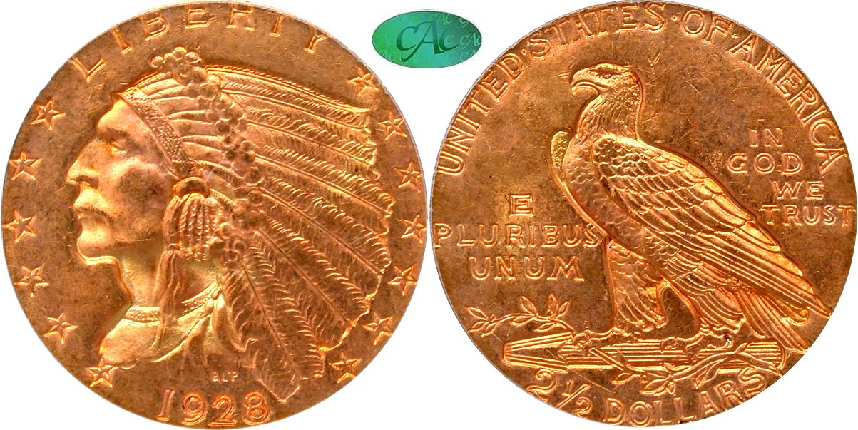 1928 PCGS MS64 CAC OGH - Gem Original - CAC-approved, PCGS gold is red hot in the current environment, and this piece will attract enthusiastic bidding. Rose-gold blankets both sides of this near-gem uncirculated quarter eagle, with only a few marks surrounding the eagle's head. As with all Indian $2.50s, this piece from the second-to-last year of issue was struck with a mintage of less than a million pieces. An ideal piece for a U.S. gold type set. Housed in a PCGS Gen 3.1 (1993-1998) old green holder with CAC approval. PCGS #4553310.