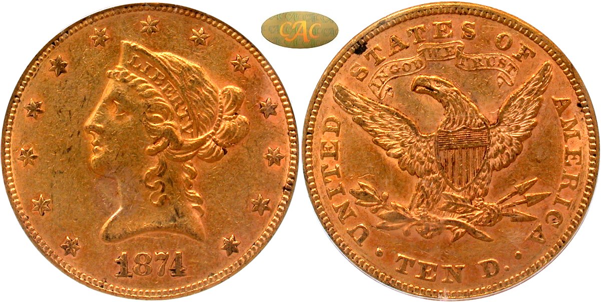 Lot 12 - 1874 PCGS AU55 Gold CAC OGH - United States $10 Gold