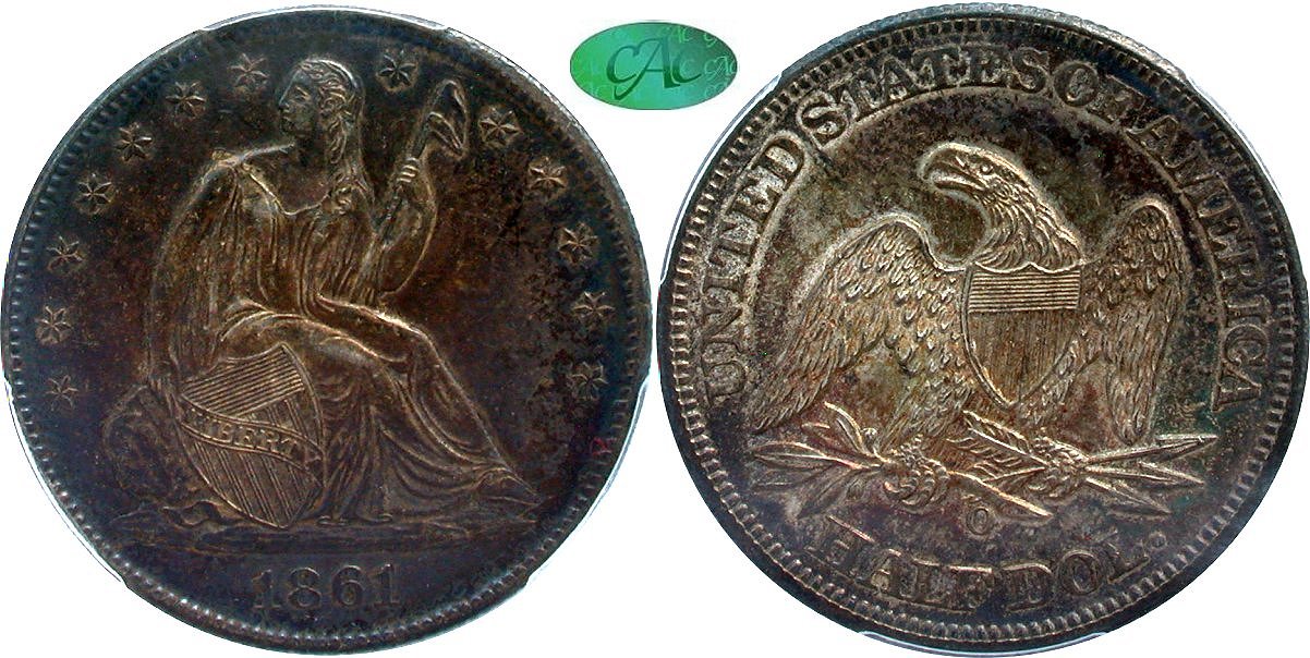 Very Scarce Louisiana Issue, Gem Original.. This Louisiana W-5 die pairing example is highly desirable for two reasons. First is the GFRC-Gem quality rating as the bright light eye appeal is truly compelling. Second is the scarcity of the die marriage as reported by Wiley and Bugert along with my own assessment via the Sales Archive with only three pieces handled since 2014. This is a marvelous example with steely fields and crusty toning on the obverse while the reverse is much more transparent to the underlying luster. When viewed under a bright light, the spinning reverse cartwheels are enticing as is the rose and aquamarine coloration. The PCGS attribution is accurate with a bold arcing die crack through the base along with two small diagonal lines in the upper right shield being easily seen with a 10x. Yes, the images leave much to be desired as this lot proved difficult to photograph. Please rest assured that the Gem rating is warranted and the winning bidder will be more than satisfied upon the lot's arrival. The CAC census currently stands at 47 with 5 in the AU58 grade. The CDN CAC guide is $1,620 for reference. Housed in PCGS Gen 6.1 (2020-2024) holder with CAC approval. The label documents the die variety attribution as W-05 LA Issue. December 1969