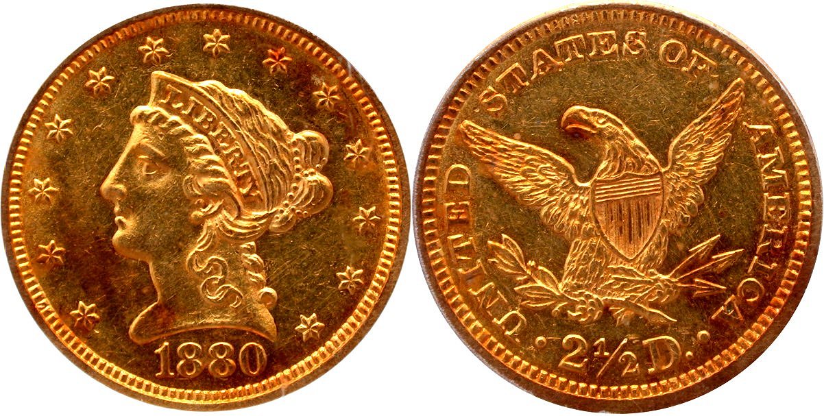 Noteworthy Eye Appeal, Rich Honey-Gold, Steely Luster, Choice Overall. The release of an old time $2.5 Liberty gold collection continues with this 1880 Philadelphia example. This is a better date with only 2,960 pieces issued. Rich honey-gold, that borders on orange-gold, should be evident from the GFRC images. Under a bright light, the obverse exhibits sharp reflectivity from lightly mirrored fields while the reverse radiance being a tad more steely. The strike is complete with well defined motifs. Surface and field rub is noted primarily in the obverse. A choice example that is fairly priced. Housed in PCGS Gen 3.1 (1993-1998) old green holder. December 1969