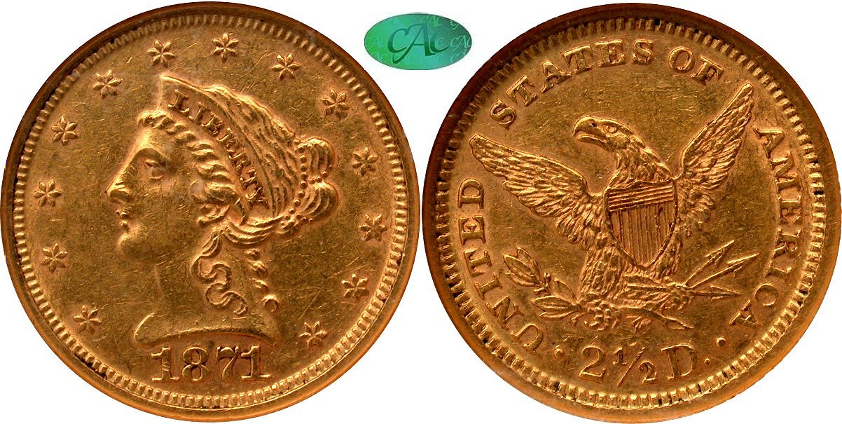 Superb Eye Appeal, Steely Fields, Honey Green-Gold, Choice Surfaces, Low CAC Population. Mintage for 1871 Philadelphia $2.5 gold amounted to only 5,320 strike. Many will be found with varying mirrors. This example offers fields that fall into the steely realm with some reflectively under a bright light. The coloration is an expected green-gold. Strike is 100% complete with fully detailed stars, hair curls, and reverse motifs. A few wispy lines are seen are both sides both none of any consequence. The CAC census presently stands at 15 with none certified at CACG. The population report indicates three at the AU58 level followed by three in "62" at triple the premium. Given the low availability when this choice, we have priced this lot at the CDN CAC MS60 guide level. Worthy of special consideration. Housed in NGC 25 (2008) holder with CAC approval. December 1969