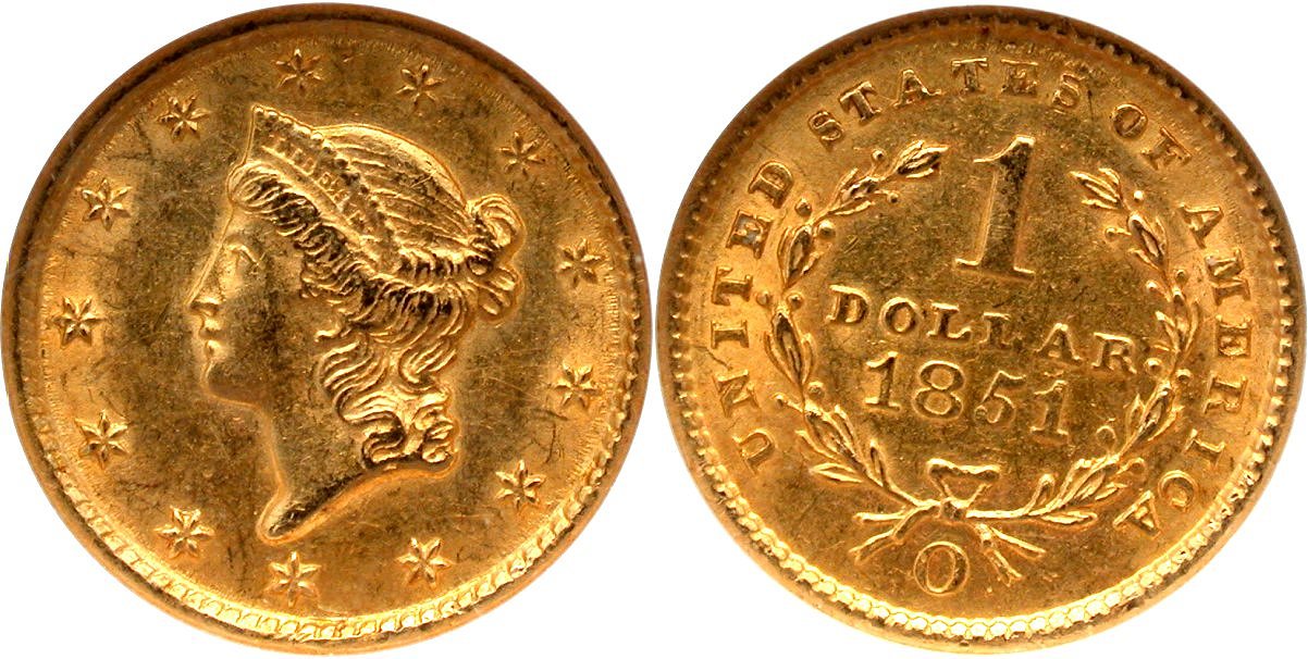 Choice Original. Honey green-gold colors and frosted lister are promptly noted when placing this 1851-O $1 gold piece under angled lighting. Light rub is present on the center hair curls and in the fields. This is a boldly struck example with completely defined star centers and hair curls. The fields are pleasing and essentially unabraded. GFRC images provide an accurate illustration of the choice surfaces. From a old time collection that has been off the market for nearly two decades. Housed in NGC Gen 17 (2004-2008) holder. December 1969