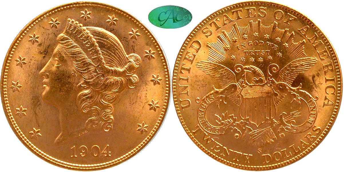 Gold Type Set Candidate, Rich Honey-Gold, Swirling Cartwheels, A Premium MS64 . The 1904-S is one of the most common in the Liberty double eagle series and thus, ideal as a type set piece as premiums are minimal. When building a type set, eye appeal should be top of the list along with originality. Well, this new purchase offers both. Granular frosted luster radiates from the surfaces while the cartwheels fall in the "swirling" category. Of course, this is under a bright light. Coloration is a rich honey-gold. At the MS64 level, CDN CAC price guide is $3250 with a jump to $9380 in "65". Worthy of consideration. Housed in PCGS Gen 4.4 (2005-2011) holder. December 1969